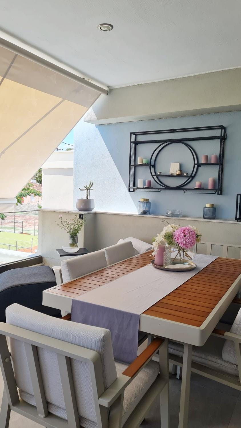Great apartment. It has everything you need. We didn't do a lot of cooking as we were going out, but the kitchen seems to have everything you need, with a dishwasher, good quality utensils, and cutlery. The bathroom is compact, but again, it has everything you need, including a good washing machine. The bedroom bed and sofa bed were very comfortable. The balcony is very big and the outdoor furniture was very comfortable and estetically pleasing. The balcony is beautifully decorated, contributing to the amazing atmosphere. The air conditioning was very good to maintain temperature in both the bedroom and living room. There was an iron, ironing board and hoover available. The communication with the host was really good. He was very welcoming. Definitely would recommend it. The location is good as it is only a 15-20 minute walk to the town centre and beach. The surrounding area is very peaceful and quiet, great for families. However, we were going to the beach in Ammolofoi and with car it's only 7-10 minutes so for us the location was very good.