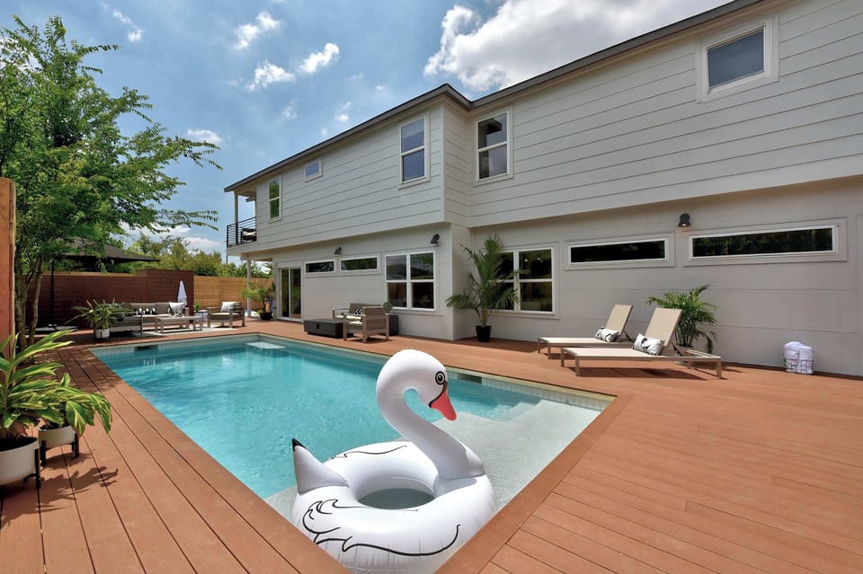 This contemporary home in East Austin can fit up to 32 guests with its 12 bedroom, 6 bathroom, and minutes from downtown Austin. With its ample amenities, including an outdoor area with a pool, this home is great for those exploring Austin. The professionally designed spaces offer open-concept layouts and kitchen & dining spaces perfect for entertaining.