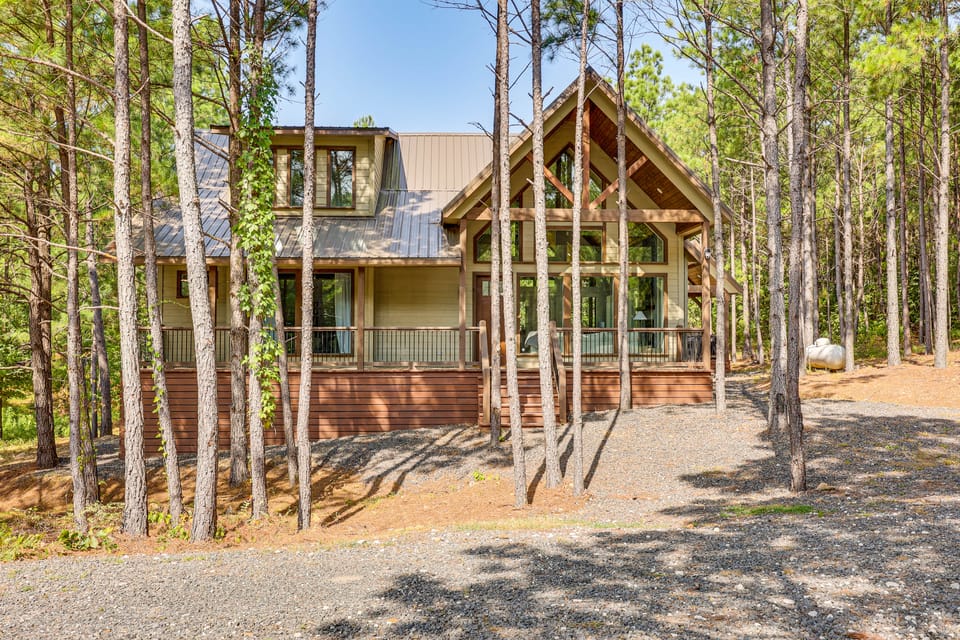 Craving comfort and adventure in the heart of nature? This upscale 3-bed, 3.5-bath vacation rental cabin is a new build in Broken Bow that offers the perfect blend of high-end finishes and rustic charm. Soaring ceilings, walls of windows, and modern furnishings create a light-filled, lodge-style retreat. Fill your days at the scenic Beavers Bend State Park, hiking, and paddleboarding with the family!