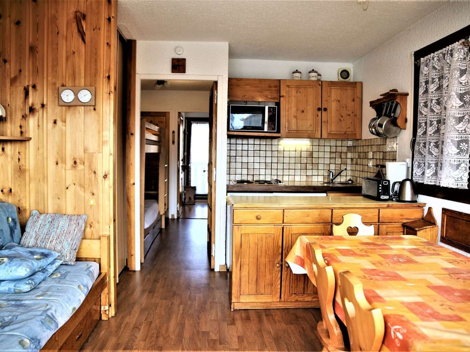 Nicely decorated and well-equipped apartment with a double bed bedroom, in ski to door residence. Renovated bathroom with large shower. South facing balcony with magnificent view on the Ecrins summits.