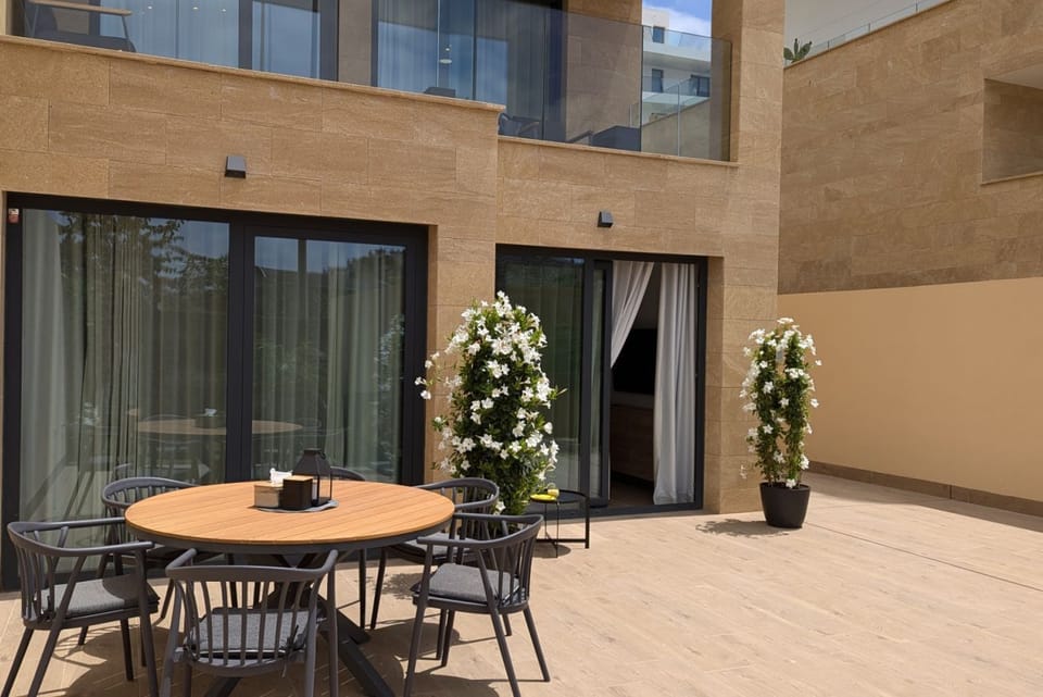 From the living room, you can step out into your own cosy patio, where you can enjoy morning coffee or an evening outdoors.