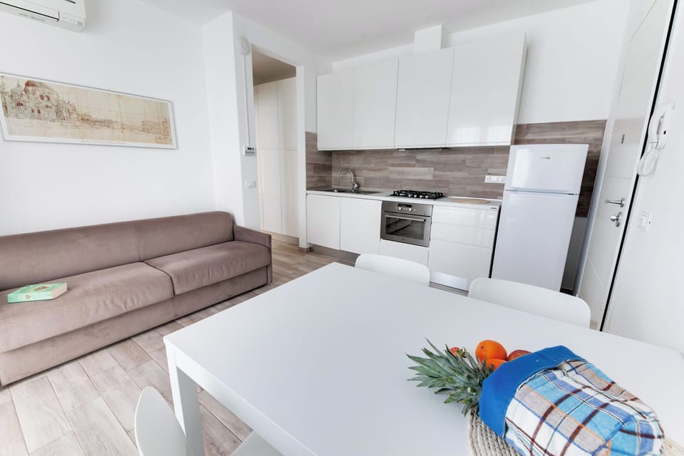 'apartment SCOLA 12, of about 40 square meters is located in the elegant complex of Casa Scola on the first floor. It was built with the most up-to-date technologies and design. It is located in a very central area, a hundred meters from the sea, in a quiet, ventilated and silent position, very close to the new dock and the characteristic square of the city. Theapartment has a large balcony of 20 square meters that embraces the perimeter and increases in depth on one side, creating a large space, complete with outdoor furniture, for outdoor situations. The house has a private parking space, thermal soundproofing fixtures, air conditioning and consists of: carefully furnished living room with sofa bed that can be transformed into a double bed, 32"led TV, SATELLITE TV, kitchenette with large modular kitchen, complete with utensils and dishes, with four-fire top, traditional oven, microwave oven, dishwasher, sink, fridge with separate freezer; walk-in closet, large windowed bathroom with 140 x 80 cm shower box and hairdryer, sanitary ware and designer taps; bedroom with double slatted bed and single slatted bed (5 total beds), safe, Wi-Fi connection; laundry and winter heating.