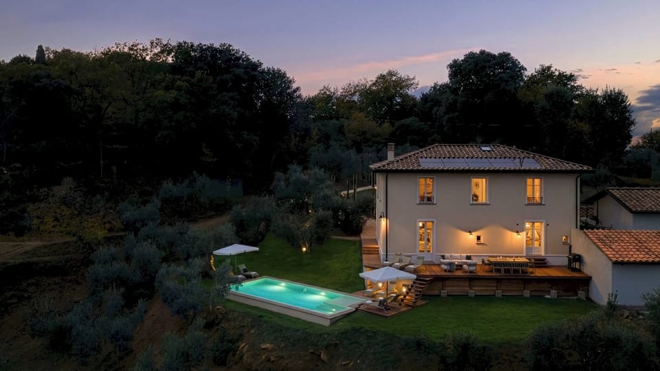 Immersed in the quiet of the Tuscan hills, a short distance from the medieval village of Volterra, Villa Francesca is the ideal destination for those looking for an authentic charming experience in the countryside. The villa, recently built and inserted in a centuries-old olive grove, welcomes guests with natural elegance. The interiors, warm and welcoming, open onto a large living area with living room and dining room overlooking a terrace overlooking the valley, perfect for enjoying the silences, light and views that are lost among olive trees, cultivated fields and woods. The rooms, with attention to detail, offer relaxing views of the valley. The olive grove, the manicured lawns and the pool area, also terraced, complete the typical wellness experience of the Tuscan countryside. A short distance from the region's main attractions and the Etruscan Coast, Villa Francesca offers hospitality where comfort, authenticity and landscape meet in perfect balance. It should be noted that the owners live in an adjoining villa, but the property reserved for guests is completely separate and designed to ensure maximum privacy.