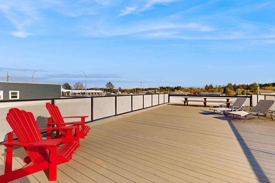 The interior is bright, modern, and thoughtfully furnished, creating a welcoming retreat after a day of surfing, beachcombing, or exploring town. The whole group can unwind with a board game at the dining table or stream their favorite show in the living room. The fully equipped kitchen features stainless steel appliances, perfect for preparing a family meal before enjoying the sunset.