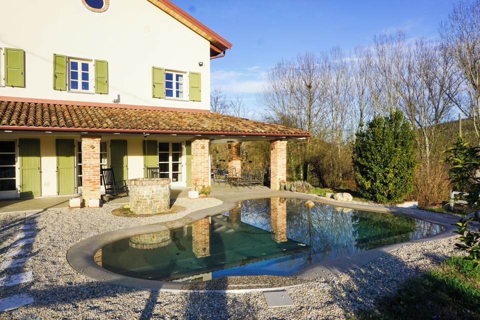 A stunning country house with a private pool and barbecue area, nestled in the tranquil hills and vineyards of Monferrato, a UNESCO World Heritage site. The property offers five bedrooms, each room with ensuite bathroom and private entrance (one bedroom has air conditioning, the other ones have modern ceiling fans), ideal for groups of friends or couples wishing to share a holiday together while maintaining their privacy. The spacious common areas include a bright living room with a seating area, wood-burning stove, and dining area, as well as a large kitchen with a central island perfect for cooking and sharing. Outside, the salted-water pool and green spaces offer the perfect setting to relax, enjoy the views, and fully experience the tranquility of the countryside. The house is located just minutes from the center of Nizza Monferrato and strategically positioned close to renowned wineries and restaurants, and the most charming villages of Monferrato, the Langhe, and Roero. Ideal for relaxing holidays, food and wine tours, and stays immersed in nature, comfort, and privacy.
