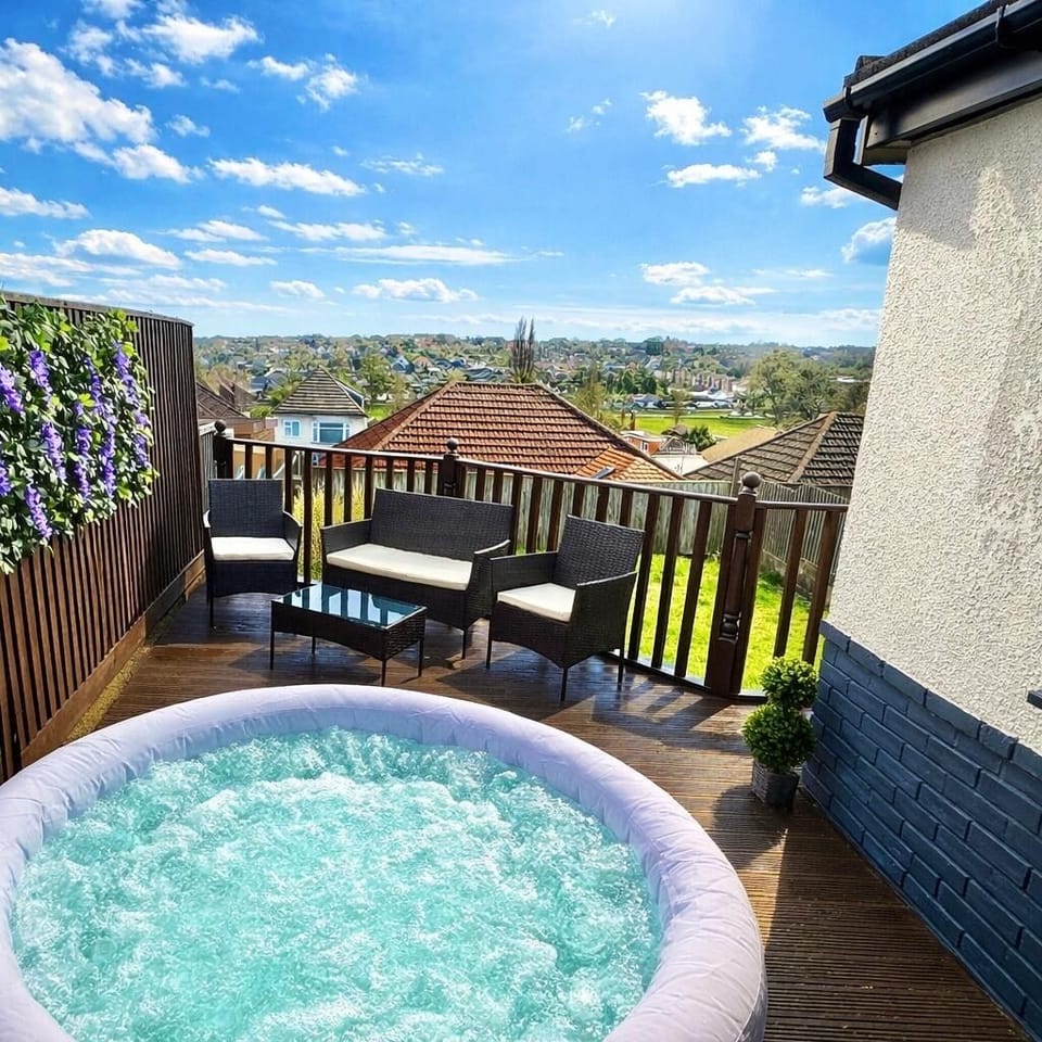 Downstairs, you’ll find a bright and welcoming living room featuring a comfortable sofa bed, perfect for an extra guest or lounging after a day out. The open dining area provides a great space for shared meals and connects directly to the decked terrace, where you can unwind in the private hot tub while enjoying peaceful views over the garden. The fully equipped kitchen is also located on the ground floor and opens onto the same decked area, making it easy to cook, dine, and socialise. It includes all essential cooking amenities along with a convenient laundry area and an adjacent WC.