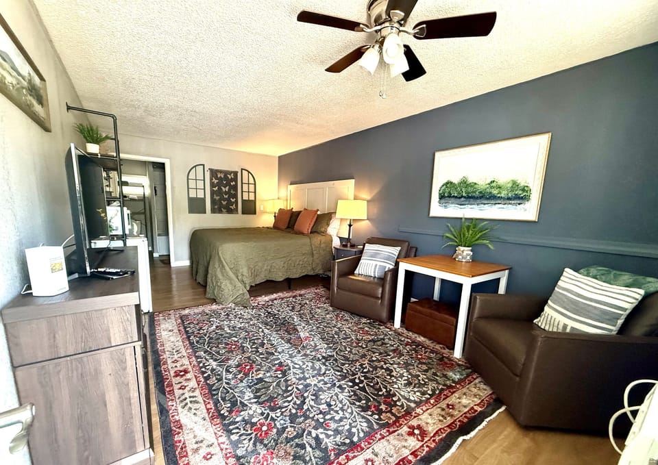 Creekside Retreat: Spend some time relaxing at our vintage, boutique motel downtown Hollister, MO. We are only 1 mile to the Branson Landing and downtown. But out of the hustle and bustle of city traffic. You are within walking distance to downtown Holliter with plenty of restaurants, coffee shops, and local shopping. We are a vintage motel built in 1958 and have been renovated. We are also located on a beautiful creek! Room 11 is a king room on the front/street side of the building. It has a good sized bathroom with a tub and two swivel chairs in the main area. We are a self check in property. You will receive check in instructions the morning of your arrival.
