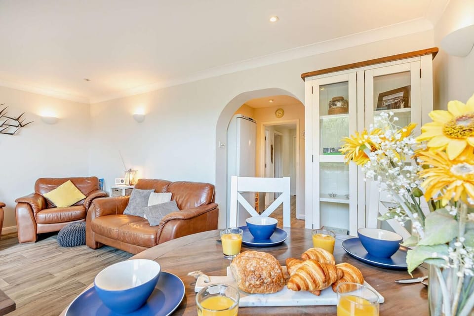 Part of a group of apartments, this one is on the ground floor. Step inside, leave your sandy shoes or muddy boots in the porch, and relax in the lounge on the comfy sofa and chairs while enjoying a movie on the Smart TV. Open the patio doors to let in the fresh sea air as you enjoy your popcorn. The kitchen is fully equipped to whip up a hearty breakfast or your favorite meal. There are two bedrooms: a double bedroom and a king-size zip-and-link (which can be made into 2’6” twin beds if needed). The apartment also has a family bathroom with a shower over the bath and WC.