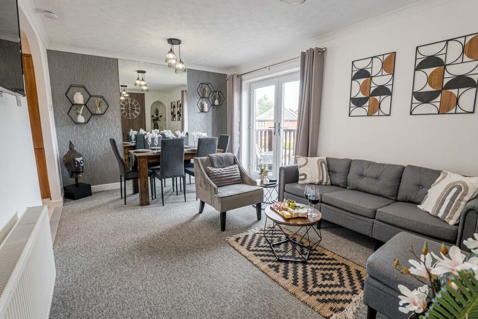 A bright and airy space with large glass doors that flood the room with natural light, creating an inviting ambiance. The sophisticated and luxurious atmosphere is accentuated by a soft grey colour palette, modern panelling and carefully curated light fittings.