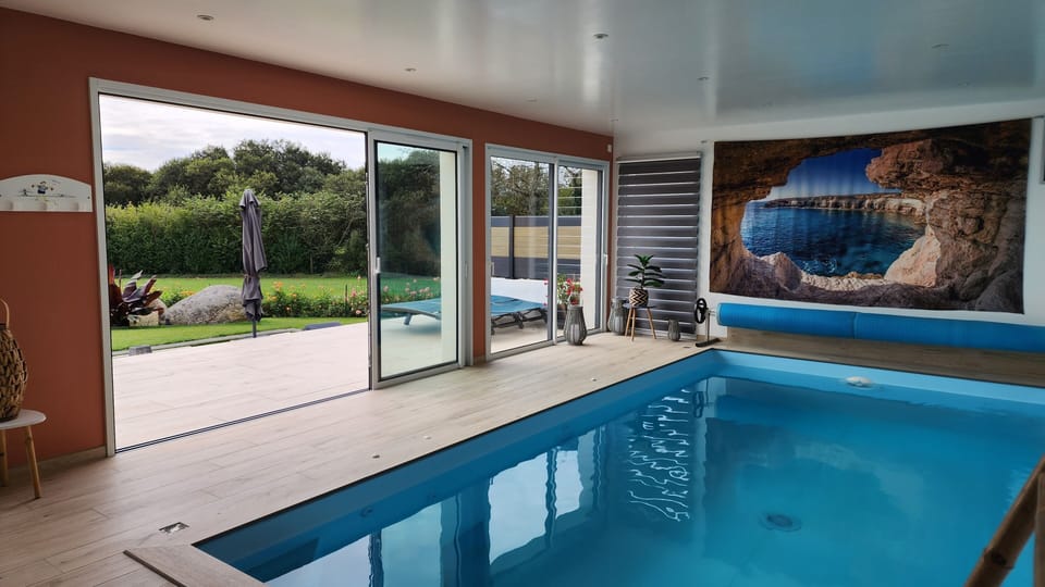 NEW 2022: Indoor swimming pool from July 2022. Size 6m x3 m with corner stairs and 4 massage jets. A large terrace facing south, along the length of the pool.