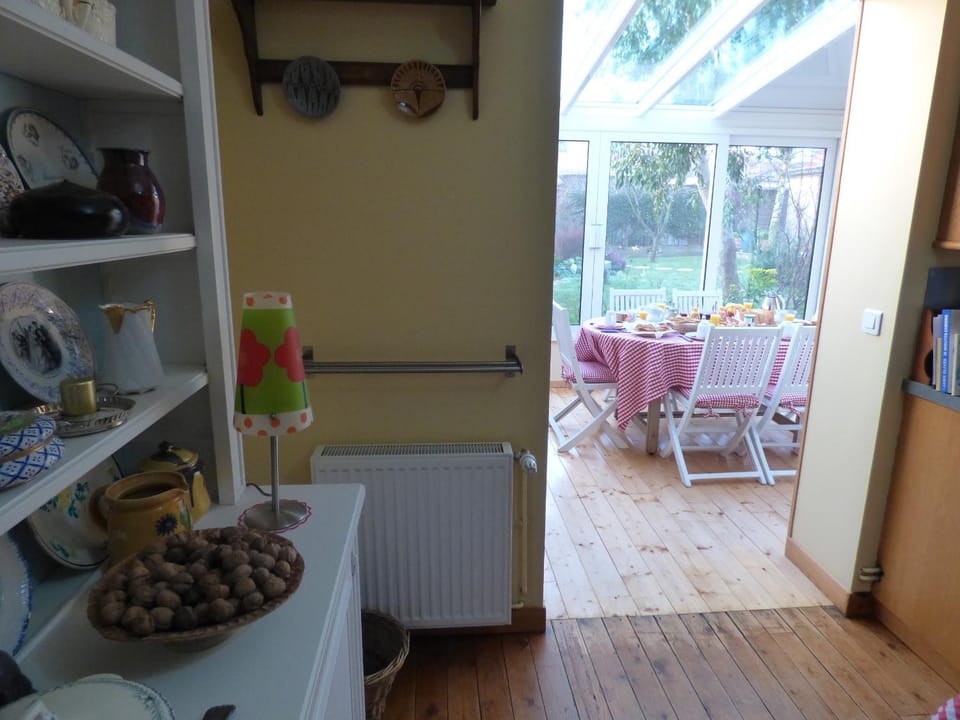 Petit déjeuner pris, en commun, avec les autres hôtes, dans la véranda, avec vue jardin. Vous y partagez un délicieux pain du jour fait maison par Claude, accompagné de confitures maison, œufs, fromage, yoghourts et petite intention de la part de Valérie, tous les jours une pâtisserie différente, crêpes, gaufres, cake, tarte. Bref, vous quitterez la table repu et prêt à entamer vos nouvelles aventures à pied ou en vélo. Elles ne ne manquent pas dans la région.