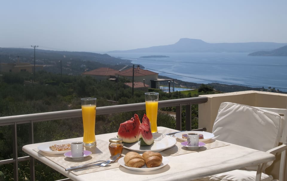 It is a studio of 50 sqm, fully equipped in a modern style, yet in direct contact and harmony with the nature around it. Situated on the eastern side of a larger home where our family lives, on a private plot of 4 acres full of olive trees and pine trees, shrubs, herbs and wildflowers of local flora and with a splendid view of the Souda bay and the mountain range of the White Mountains.All around, the tweets of birds and the hum of cicadas is heard.
