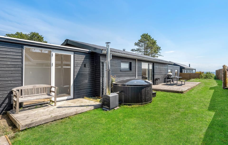 Spend your vacation in the first row on a beautiful garden plot in this brand new built vacation home with wonderful panoramic views over the sea and the coast. The view was included in the construction, and also the furnishings are in first-class modern style. Three beautiful bedrooms, a nice bathroom and a guest toilet await you. The activity room with table tennis and darts invites you to many entertaining hours.